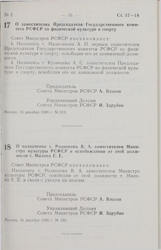 Постановление Совета Министров РСФСР. О заместителях Председателя Государственного комитета РСФСР по физической культуре и спорту. 15 декабря 1988 г. № 519