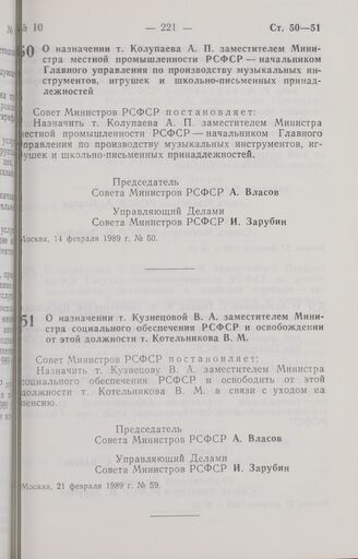 Постановление Совета Министров РСФСР. О назначении т. Кузнецовой В.А. заместителем Министра социального обеспечения РСФСР и освобождении от этой должности т. Котельникова В.М. 21 февраля 1989 г. № 59