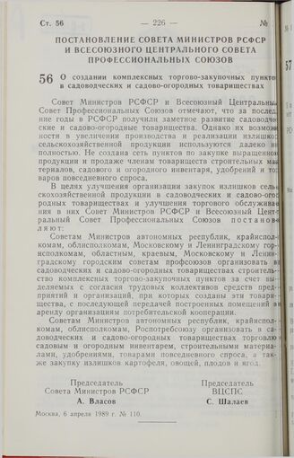 Постановление Совета Министров РСФСР и Всесоюзного Центрального Совета Профессиональных Союзов. О создании комплексных торгово-закупочных пунктов в садоводческих и садово-огородных товариществах. 6 апреля 1989 г. № 110