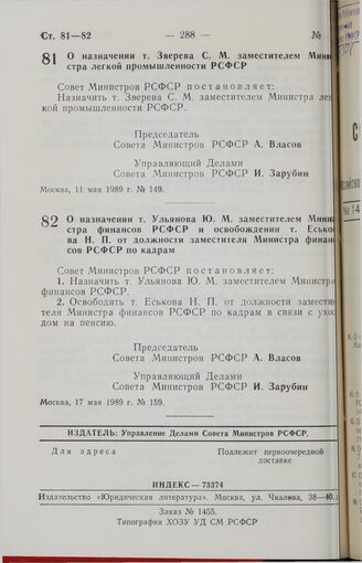 Постановление Совета Министров РСФСР. О назначении т. Ульянова Ю.М. заместителем Министра финансов РСФСР и освобождении т. Еськова Н.П. от должности заместителя Министра финансов РСФСР по кадрам. 17 мая 1989 г. № 159