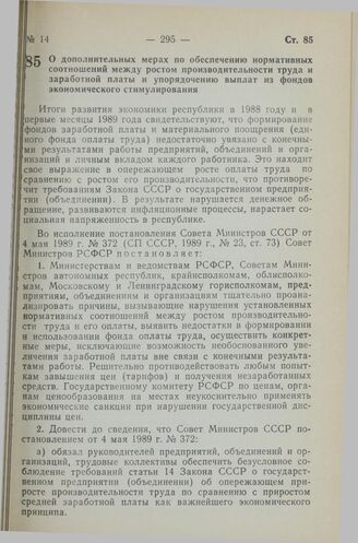 Постановление Совета Министров РСФСР. О дополнительных мерах по обеспечению нормативных соотношений между ростом производительности труда и заработной платы и упорядочению выплат из фондов экономического стимулирования. 19 мая 1989 г. № 160