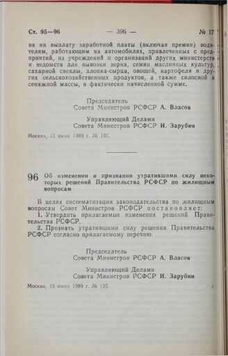 Постановление Совета Министров РСФСР. Об изменении и признании утратившими силу некоторых решений Правительства РСФСР по жилищным вопросам. 19 июня 1989 г. № 195