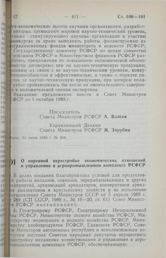 Постановление Совета Министров РСФСР. О коренной перестройке экономических отношений и управления в агропромышленном комплексе РСФСР. 3 июля 1989 г. № 206