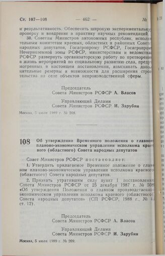 Постановление Совета Министров РСФСР. Об утверждении Временного положения о главном планово-экономическом управлении исполкома краевого (областного) Совета народных депутатов. 5 июля 1989 г. № 209