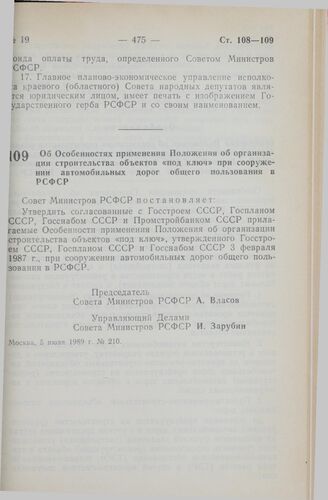 Постановление Совета Министров РСФСР. Об особенностях применения Положения об организации строительства объектов «под ключ» при сооружении автомобильных дорог общего пользования в РСФСР. 5 июля 1989 г. № 210