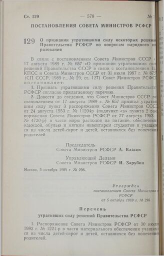 Постановление Совета Министров РСФСР. О признании утратившими силу некоторых решений Правительства РСФСР по вопросам народного образования. 5 октября 1989 г. № 296