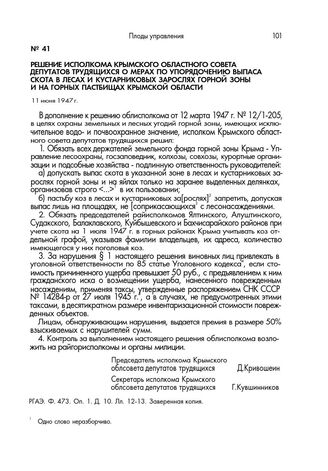 Решение исполкома Крымского областного совета депутатов трудящихся о мерах по упорядочению выпаса скота в лесах и кустарниковых зарослях горной зоны и на горных пастбищах Крымской области. 11 июня 1947 г. // РГАЭ. Ф. 473. Оп. 1. Д. 10. Лл. 12-13. Заверенная копия.