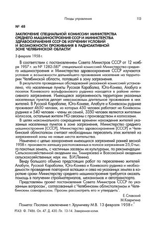 Заключение специальной комиссии Министерства среднего машиностроения СССР и Министерства здравоохранения СССР об изучении условий и возможности проживания в радиоактивной зоне Челябинской области. 3 февраля 1958 г. // РГАЭ. Ф. 7486. Оп. 47. Д. 430. Лл. 13-14. Заверенная копия.