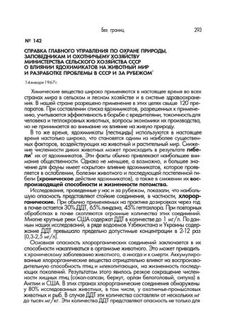 Справка Главного управления по охране природы, заповедникам и охотничьему хозяйству Министерства сельского хозяйства СССР о влиянии ядохимикатов на животный мир и разработке проблемы в СССР и за рубежом. 14 января 1967 г.