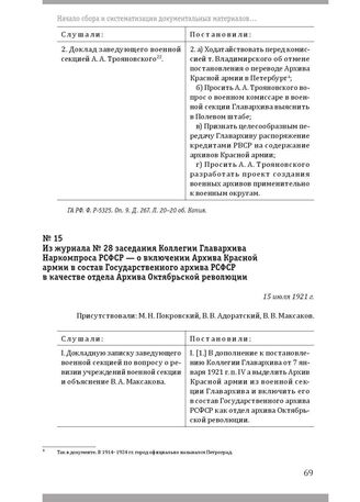 Из журнала № 28 заседания Коллегии Главархива Наркомпроса РСФСР — о включении Архива Красной армии в состав Государственного архива РСФСР в качестве отдела Архива Октябрьской революции. 15 июля 1921 г. // ГА РФ. Ф. Р‑5325. Оп. 9. Д. 267. Л. 30–31 об. Копия.