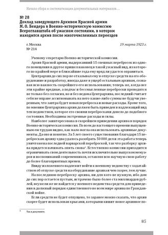 Доклад заведующего Архивом Красной армии М. О. Бендера в Военно-историческую комиссию Всероглавштаба об ужасном состоянии, в котором находится архив после многочисленных переездов. Г. Москва, 19 марта 1923 г.