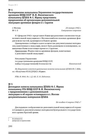 Докладная записка начальника ЦГАКА Ф. С. Юдина начальнику УГА НКВД СССР И. И. Никитинскому с предложениями о дополнительной эвакуации и об охране остающихся в г. Москве документальных материалов ЦГАКА. Не позднее 4 марта 1942 г. // РГВА. Ф. 39041. Оп. 1. Д. 258. Л. 43–46. Заверенная копия.