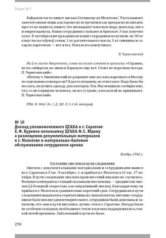 Доклад уполномоченного ЦГАКА в г. Саратове Е. Ф. Буренко начальнику ЦГАКА Ф. С. Юдину о размещении документальных материалов в г. Молотове и материально-бытовом обслуживании сотрудников архива. Ноябрь 1942 г.