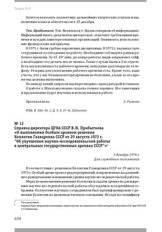 Справка директора ЦГОА СССР В. Н. Прибыткова «О выполнении Особым архивом решения Коллегии Главархива СССР от 29 августа 1973 г. «Об улучшении научно-исследовательской работы в центральных государственных архивах СССР»». 3 декабря 1974 г.