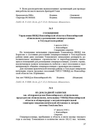 Сообщение Управления НКВД Новосибирской области в Новосибирский облисполком о размещении спецпереселенцев в Тегульдетском районе. 3 августа 1940 г. Г. Новосибирск