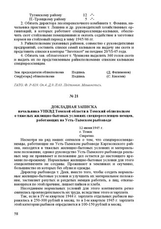 Докладная записка начальника УНКВД Томской области в Томский облисполком о тяжелых жилищно-бытовых условиях спецпереселенцев-немцев, работающих на Усть-Тымском рыбзаводе. 12 июня 1945 г. Г. Томск