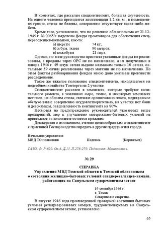 Справка Управления МВД Томской области в Томский облисполком о состоянии жилищно-бытовых условий спецпереселенцев-немцев, работающих на Самусьском судоремонтном затоне. 19 сентября 1946 г. Г. Томск