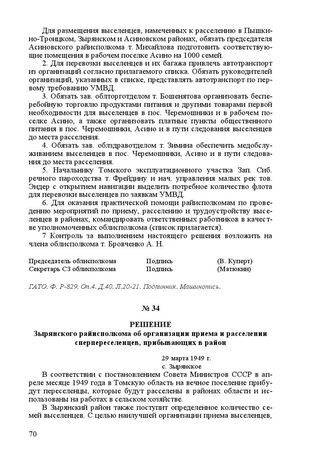 Решение Зырянского райисполкома об организации приема и расселении сперпереселенцев, прибывающих в район. 29 марта 1949 г. С. Зырянское // ЦДНИ ТО. Ф. 607. Оп. 1. Д. 47. Л. 318. Заверенная копия. Машинопись.