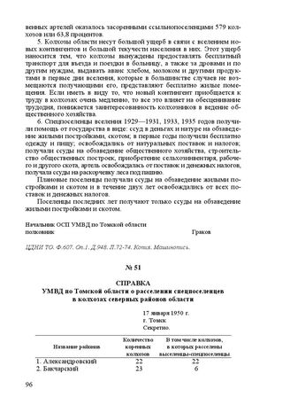 Справка УМВД по Томской области о расселении спецпоселенцев в колхозах северных районов области. 17 января 1950 г. Г. Томск // ЦДНИ ТО. Ф. 607. Оп. 1. Д. 948. Л. 70. Подлинник. Машинопись.