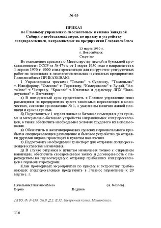 Приказ по Главному управлению лесозаготовок и сплава Западной Сибири о необходимых мерах по приему и устройству спецпереселенцев, направляемых на предприятия Главзапсиблеса. 13 марта 1950 г. Г. Новосибирск // ГАТО. Ф. Р-858. Оп. 9. Д. 2. Л. 52. Заверенная копия. Машинопись.