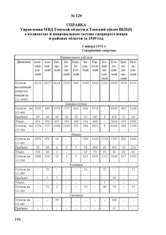 Справка Управления МВД Томской области в Томский обком ВКП(б) о количестве и национальном составе спецпереселенцев в районах области за 1949 гоД. 4 января 1950 г. // ЦДНИ ТО. Ф. 607. Оп. 1. Д. 948. Л. 61-63. Подлинник. Машинопись.