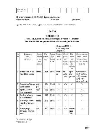 Сведения Усть-Чулымской сплавконторы в трест «Томлес» о количестве нетрудоспособных спецпереселенцев. 18 апреля 1950 г. П. Усть-Чулым