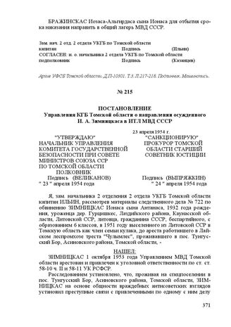 Постановление Управления КГБ Томской области о направлении осужденного И. А. Зимницкаса в ИТЛ МВД СССР. 23 апреля 1954 г. // Архив УФСБ Томской области. Д. П-10301. Т.3. Л. 219-220. Подлинник. Машинопись.