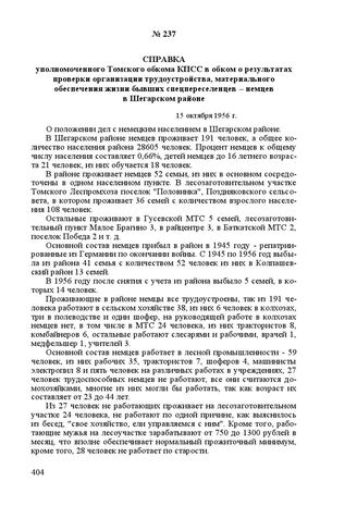 Справка уполномоченного Томского обкома КПСС в обком о результатах проверки организации трудоустройства, материального обеспечения жизни бывших спецпереселенцев - немцев в Шегарском районе. 15 октября 1956 г.
