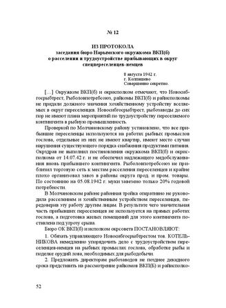 Из протокола заседания бюро Нарымского окружкома ВКП(б) о расселении и трудоустройстве прибывающих в округ спецпереселенцев-немцев. 8 августа 1942 г.