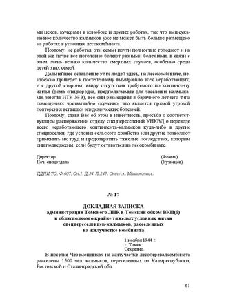 Докладная записка администрации Томского ЛПК в Томский обком ВКП(б) и облисполком о крайне тяжелых условиях жизни спецпереселенцев-калмыков, расселенных на жилучастке комбината. 1 ноября 1944 г.