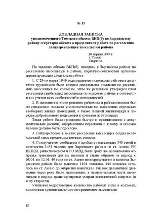 Докладная записка уполномоченного Томского обкома ВКП(б) по Зырянскому району секретарю обкома о проделанной работе по расселению спецпереселенцев по колхозам района. 20 апреля 1949 г. // ЦДНИ ТО. Ф. 607. Оп. 1. Д. 47. Л. 316-317. Подлинник. Машинопись.
