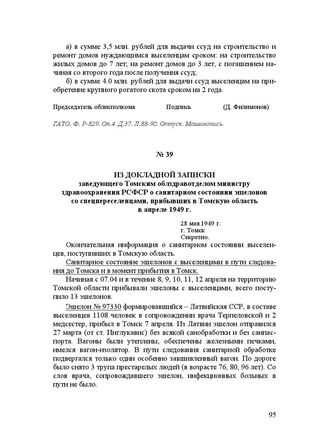 Из докладной записки заведующего Томским облздравотделом министру здравоохранения РСФСР о санитарном состоянии эшелонов со спецпереселенцами, прибывших в Томскую область в апреле 1949 г. 28 мая 1949 г. // ЦДНИ ТО. Ф. 607. Оп. 1. Д. 47. Л. 330-343. Копия. Машинопись.