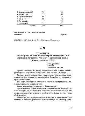 Отношение Министерства лесной и бумажной промышленности СССР управляющему трестом "Томлес" об организации приема спецпереселенцев в 1950 г. 20 января 1950 г. // ГАТО. Ф. Р-858. Оп. 9. Д. 2. Л. 38. Заверенная копия. Машинопись.