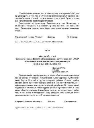 Ходатайство Томского обкома ВКП(б) в Министерство внутренних дел СССР о дополнительном вселении спецпереселенцев в северные районы области. 1 февраля 1950 г. // ЦДНИ ТО. Ф. 607. Оп. 1. Д. 1317. Л. 34. Копия. Машинопись.