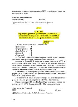 Справка секретаря партийной организации Уртамской МТС Кожевниковского района в Томский обком КПСС о воспитательной работе среди спецпереселенцев. 1 апреля 1955 г.