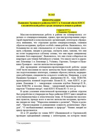 Информация Пышкино-Троицкого райкома КПСС в Томский обком КПСС о политической работе среди спецпереселенцев в районе. 4 апреля 1955 г. // ЦДНИ ТО. Ф. 607. Оп. 1. Д. 2267. Л. 99-100. Подлинник. Машинопись.