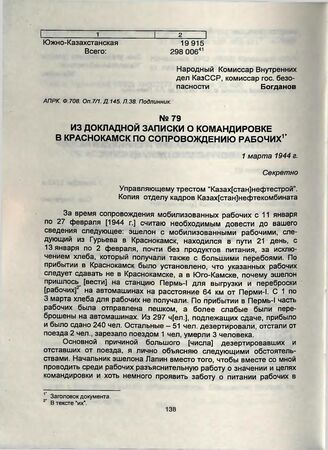 Из докладной записки о командировке в Краснокамск по сопровождению рабочих. 1 марта 1944 г. // ГА Атырауской области. Ф. 294. Оп. З. Д. 46. Л. 2-4. Подлинник.