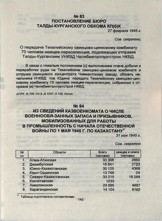 Из сведений Казвоенкомата о числе военнообязанных запаса и призывников, мобилизованных для работы в промышленность с начала отечественной войны по 1 мая 1945 г. по Казахстану. 31 мая 1945 г.