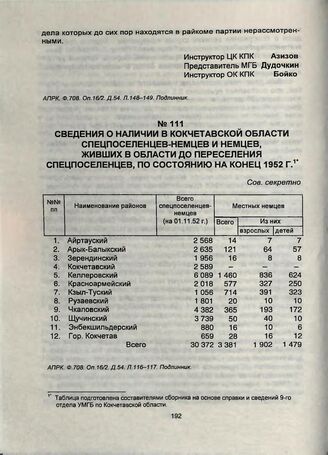 Сведения о наличии в Кокчетавской области спецпоселенцев-немцев и немцев, живших в области до переселения спецпоселенцев, по состоянию на конец 1952 г. // АПРК. Ф. 708. Оп. 16/2. Д. 54. Л. 116-117. Подлинник.