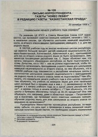 Письмо корреспондента газеты «Нойес Лебен» в редакцию газеты «Казахстанская Правда». 20 октября 1958 г.