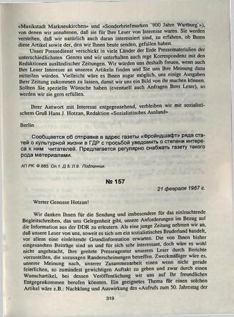 Письмо главного редактора издания «Социалистишес Аусланд» («Социалистическое Зарубежье») в редакцию газеты «Фройндшафт» и ответ на него. 21 февраля 1967 г. // АПРК. Ф. 885. Оп. 1. Л. 12. Отпуск.
