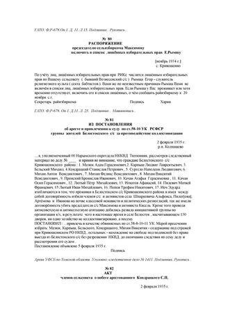 Из постановления об аресте и привлечению к суду по ст. 58-10 УК РСФСР группы жителей Белостокского с/с за противодействие коллективизации. 2 февраля 1935 г.