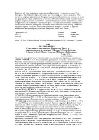 Постановление Ст. следователя при прокуроре Нарымского Округа о прекращении дела в отношении Т. Попова, А. Михня. Ф.Михня, А. Качан, Э. Иоч, В .Михня, Игнатова, М.Пилевич, Б. Пронского. 9 марта 1935 г. // Архив УФСБ по Томской области. Уголовно-следственное дело №1411. Подлинник. Машинопись.