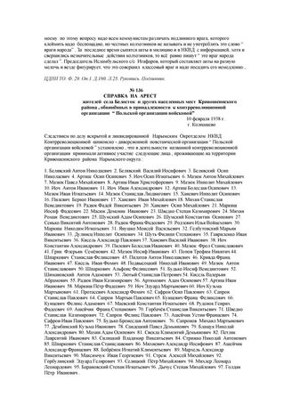 Справка на арест жителей села Белосток и других населенных мест Кривошеинского района, обвиненных в принадлежности к контрреволюционной организации “Польской организации войсковой”. 10 февраля 1938 г. // Архив ФСБ по Томской области. Уголовно - следственное дело № 830458. т.1. Машинопись. Подлинник.