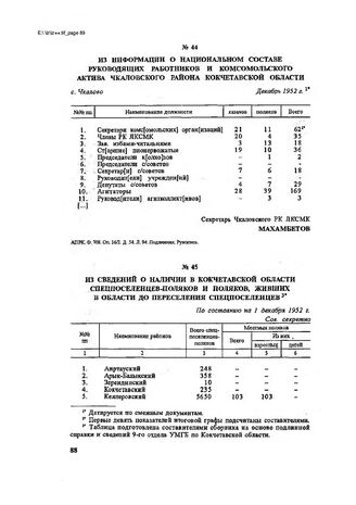 Из информации о национальном составе руководящих работников и комсомольского актива Чкаловского района Кокчетавской области. с. Чкалово, Декабрь 1952 г. // АПРК, Ф. 708. Оп. 16/2. Д. 54. Л. 94. Подлинник. Рукопись.