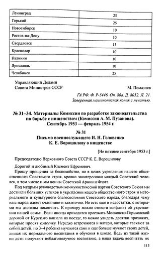 Материалы Комиссии по разработке законодательства по борьбе с нищенством (Комиссия А. М. Пузанова). Сентябрь 1953 — февраль 1954 г. Письмо военнослужащего И. Н. Головенко К. Е. Ворошилову о нищенстве [Не позднее сентября 1953 г.] // ГА РФ. Ф. Р-7523. Оп. 55. Д. 2826. Л. 4. Машинописная копия.