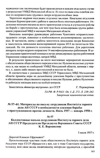 Материалы по письму сотрудников Института горного дела АН СССР о необходимости усиления борьбы с преступлениями против личности. Июль 1957 — январь 1958 г. Коллективное письмо сотрудников Института горного дела АН СССР Председателю Президиума Верховного Совета СССР К. Е. Ворошилову. 5 июля 1957 г. // ГА РФ. Ф. Р-8131. Оп. 32. Д. 5599. Л. 89-92 Заверенная машинописная копия.