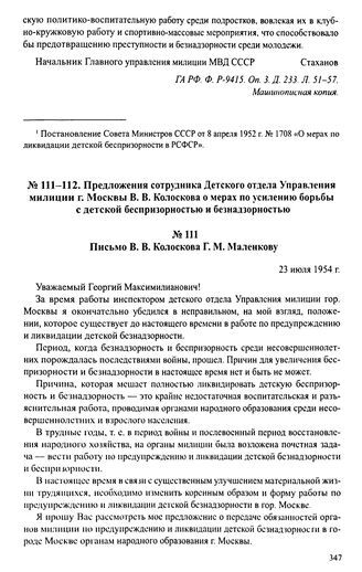 Предложения сотрудника Детского отдела Управления милиции г. Москвы В. В. Колоскова о мерах по усилению борьбы с детской беспризорностью и безнадзорностью. Письмо В. В. Колоскова Г. М. Маленкову. 23 июля 1954 г.