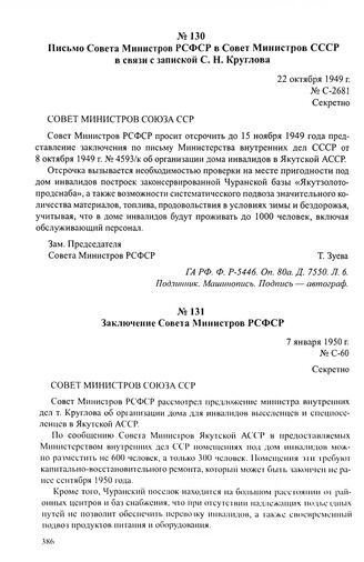 Материалы об организации в Якутии дома инвалидов для спецпоселенцев. 8 октября 1949 — 13 января 1950 г. Письмо Совета Министров РСФСР в Совет Министров СССР в связи с запиской С. Н. Круглова. 22 октября 1949 г.