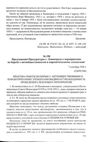 Предложения Прокуратуры г. Ленинграда о мероприятиях по борьбе с антиобщественными и паразитическими элементами. 7 сентября 1956 г. // ГА РФ. Ф. Р-8131. Оп. 32. Д. 4597. Л. 66-68. Подлинник. Машинопись. Подпись — автограф.